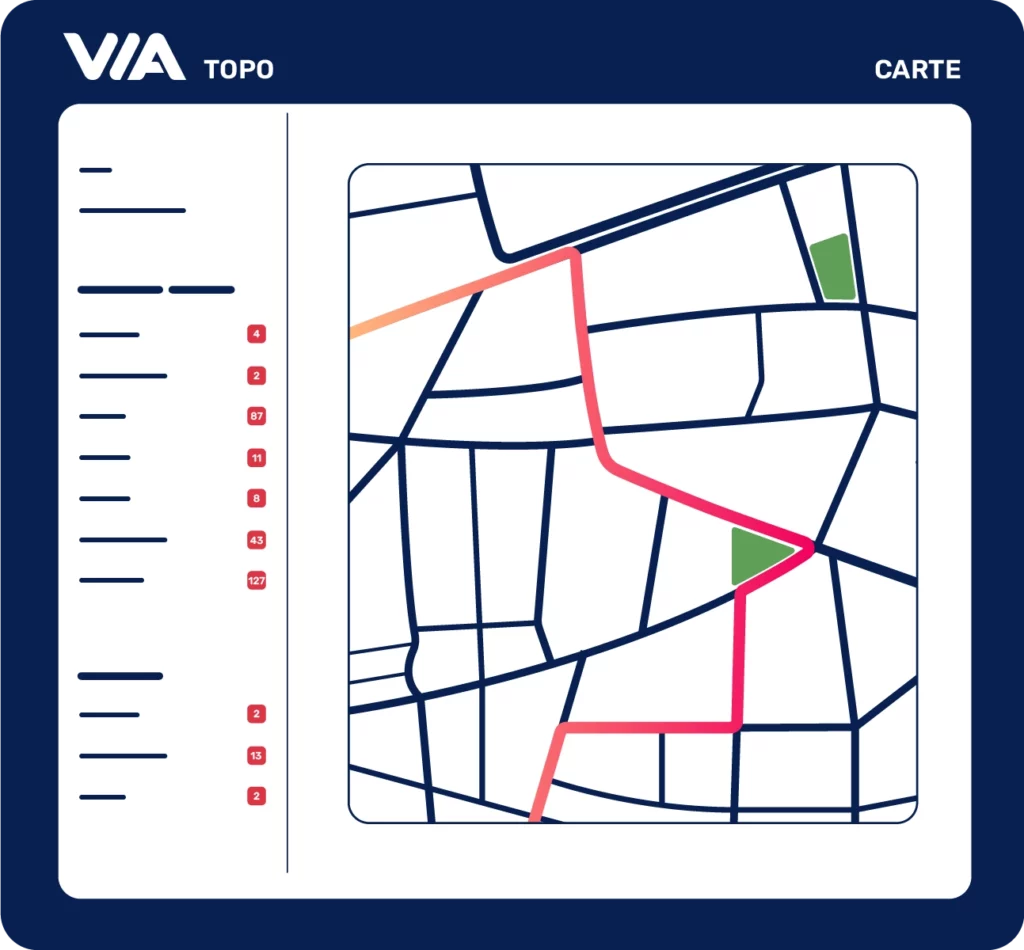 Appuyez vos choix stratégiques sur des données fiables, précises et constamment mises à jour. VIA Topo vous fournit des éléments concrets pour anticiper les besoins, rationaliser les trajets et prioriser les actions à mener sur votre territoire.